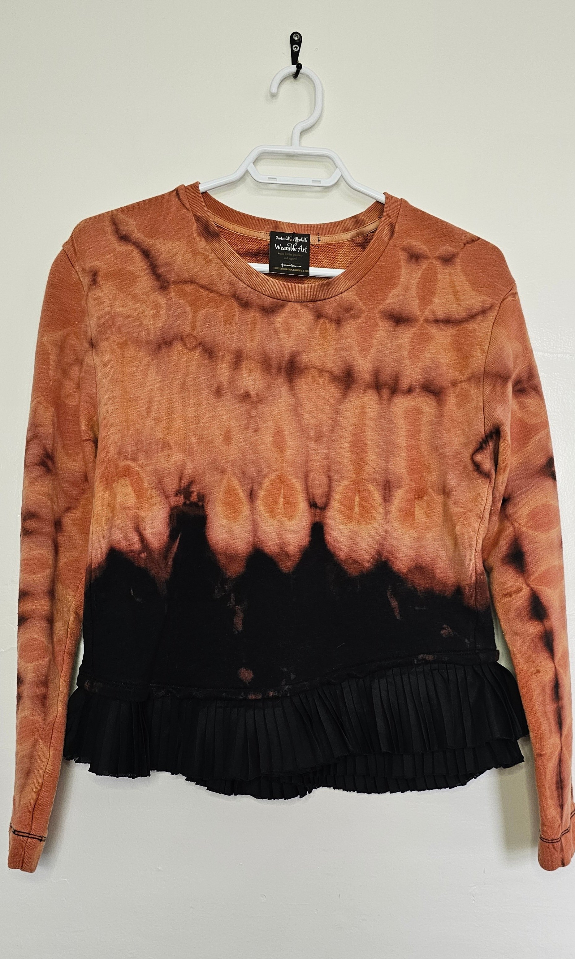 Completely unique + one of a kind tie dyed long sleeve stretchy fringed crop sweater in 100% cotton. This was lovingly reverse-dyed using bleach. Monochromatic tie dye for the punk/goth adjacent folks!