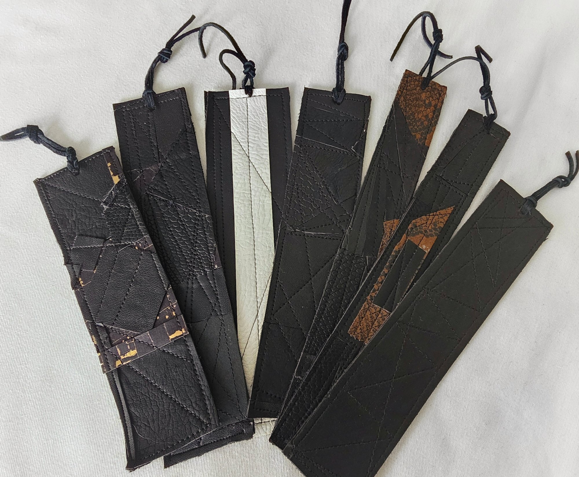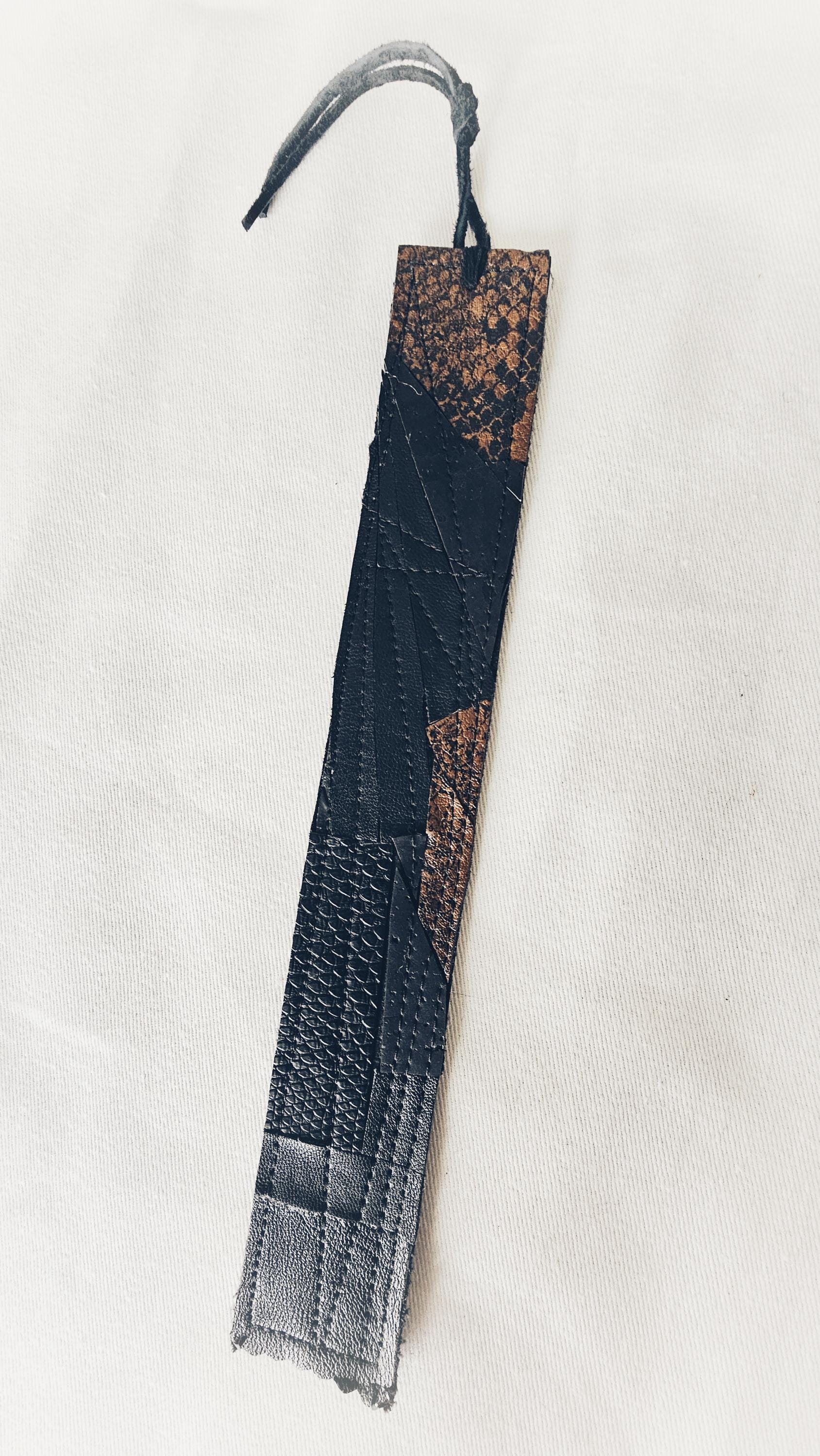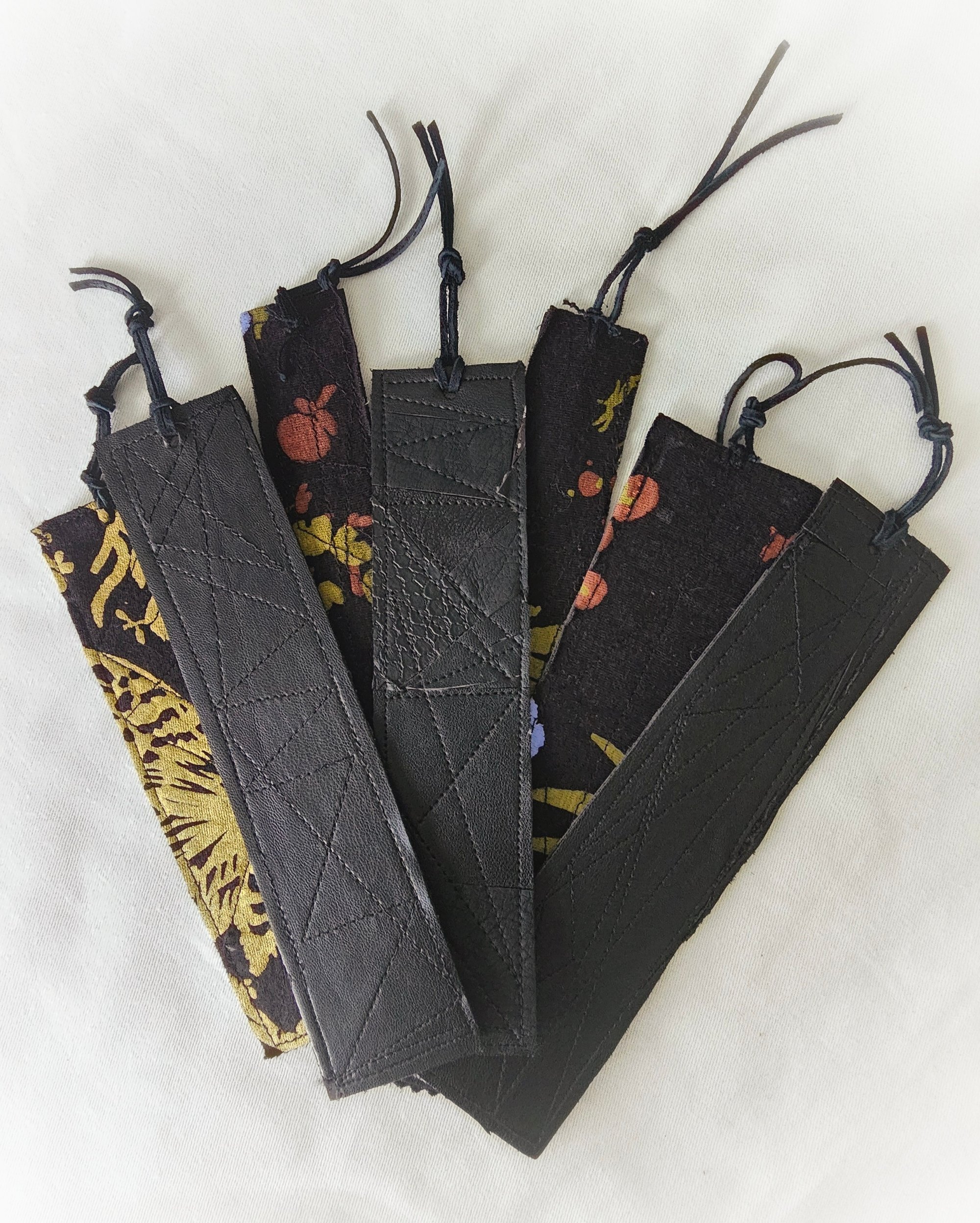 I use the smallest upcycled scraps of faux leather, deerhide and suede (donated to me by a friend) and meticulously arrange them in a puzzle-piece fashion into the small, rectangular works of creativity you see today. Several of these bookmarks are backed with sreenprinted bamboo-fabric scraps from another local creative.