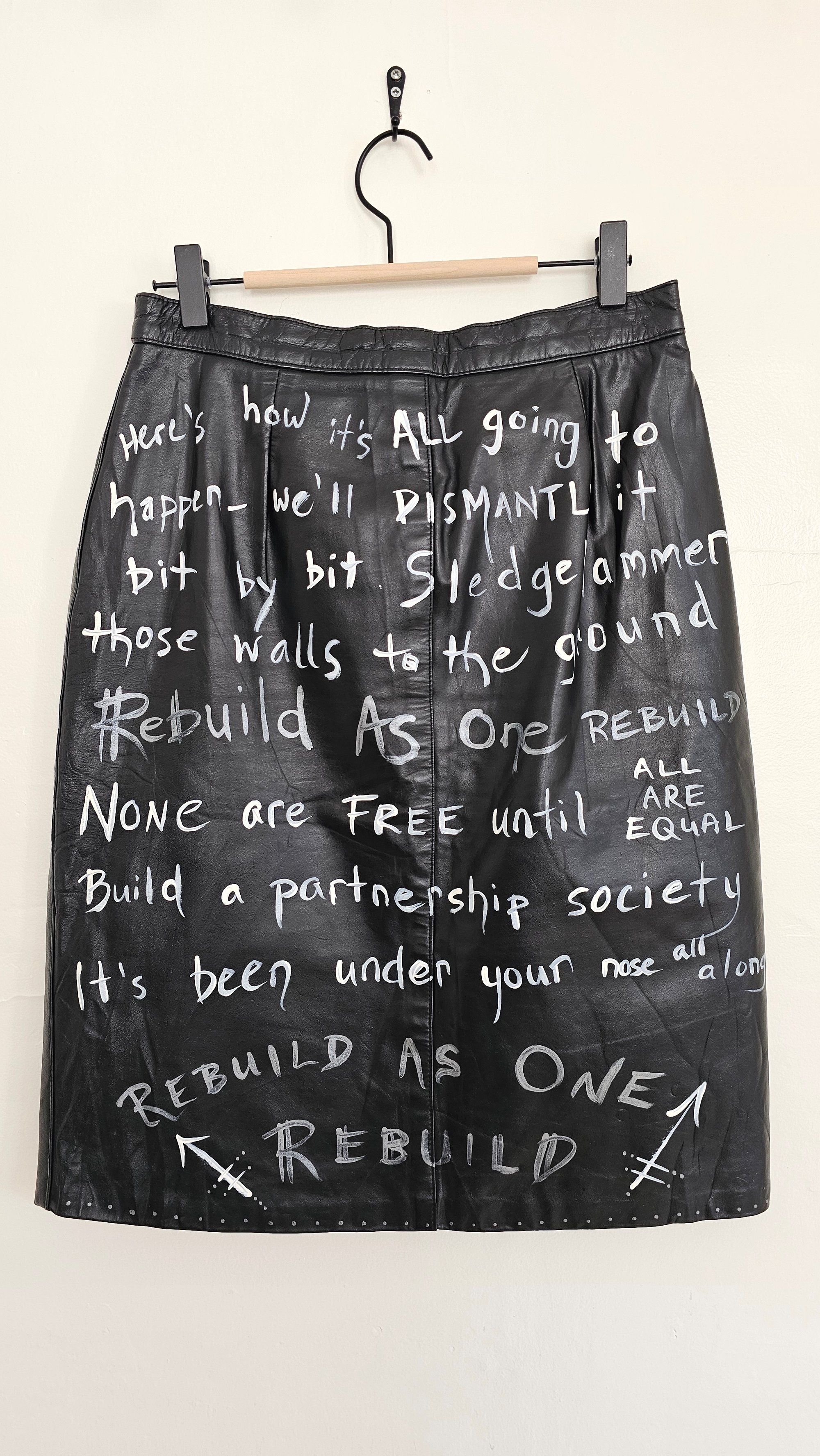 Completely one of a kind handpainted upcycled leather skirt featuring the bold lyrics "HERE’SHOW IS ALL GOING TO HAPPEN. WE'LL DISMANTLE IT BIT BY BIT. SLEDGEHAMMER THOSE WALLS TO THE GROUND. REBUILD AS ONE. REBUILD." Carefully sourced leather in excellent condition.